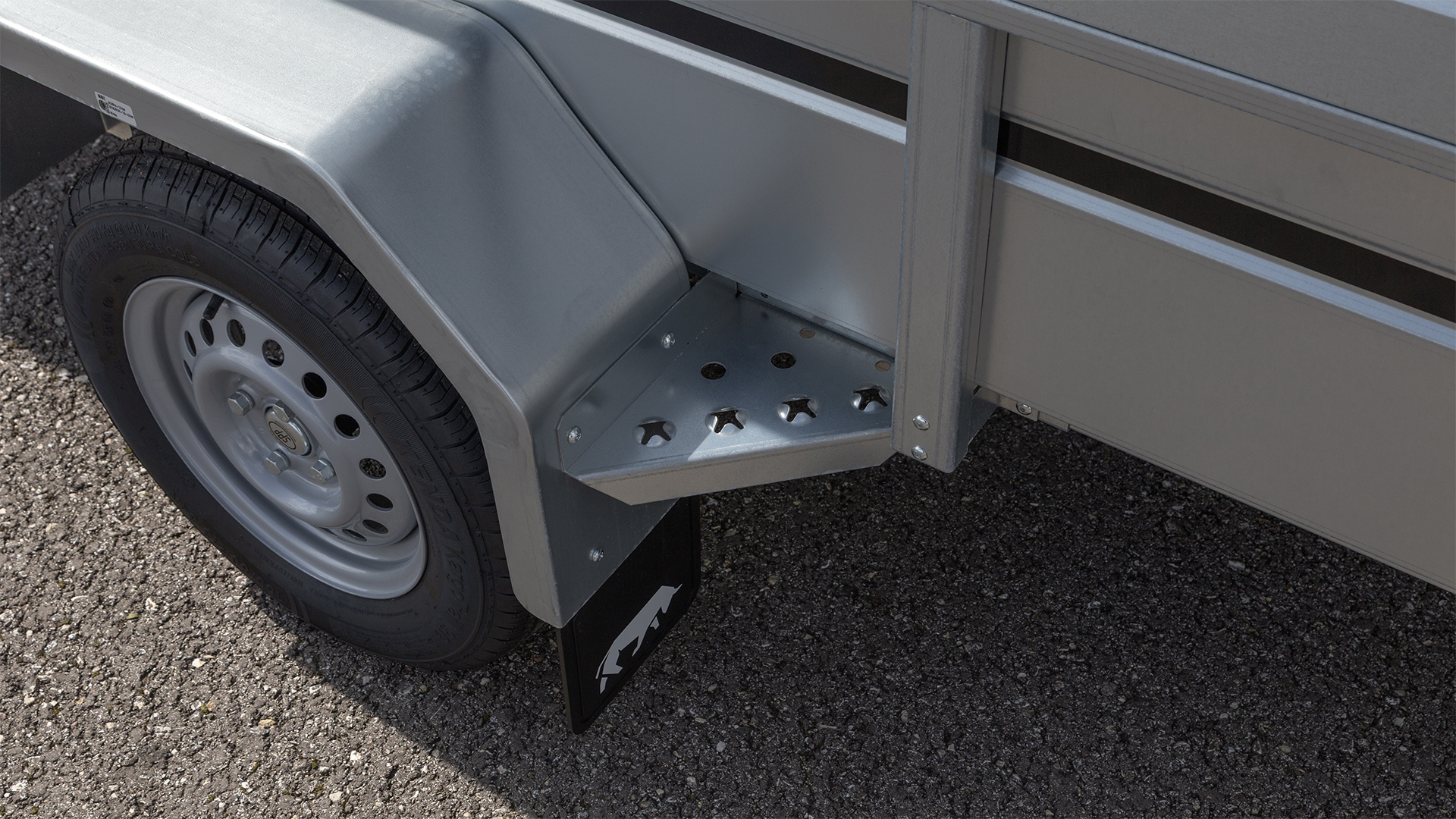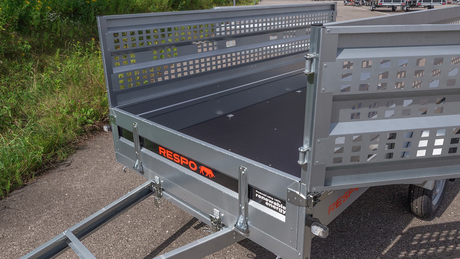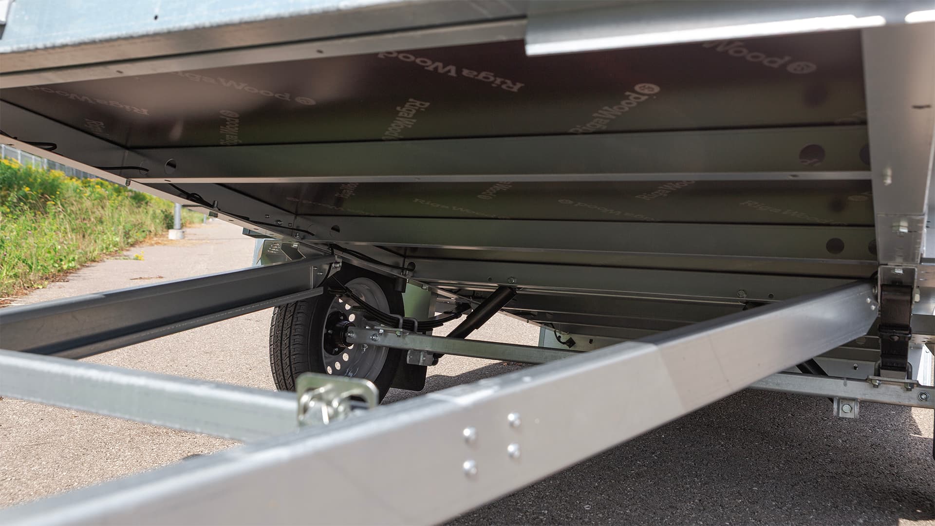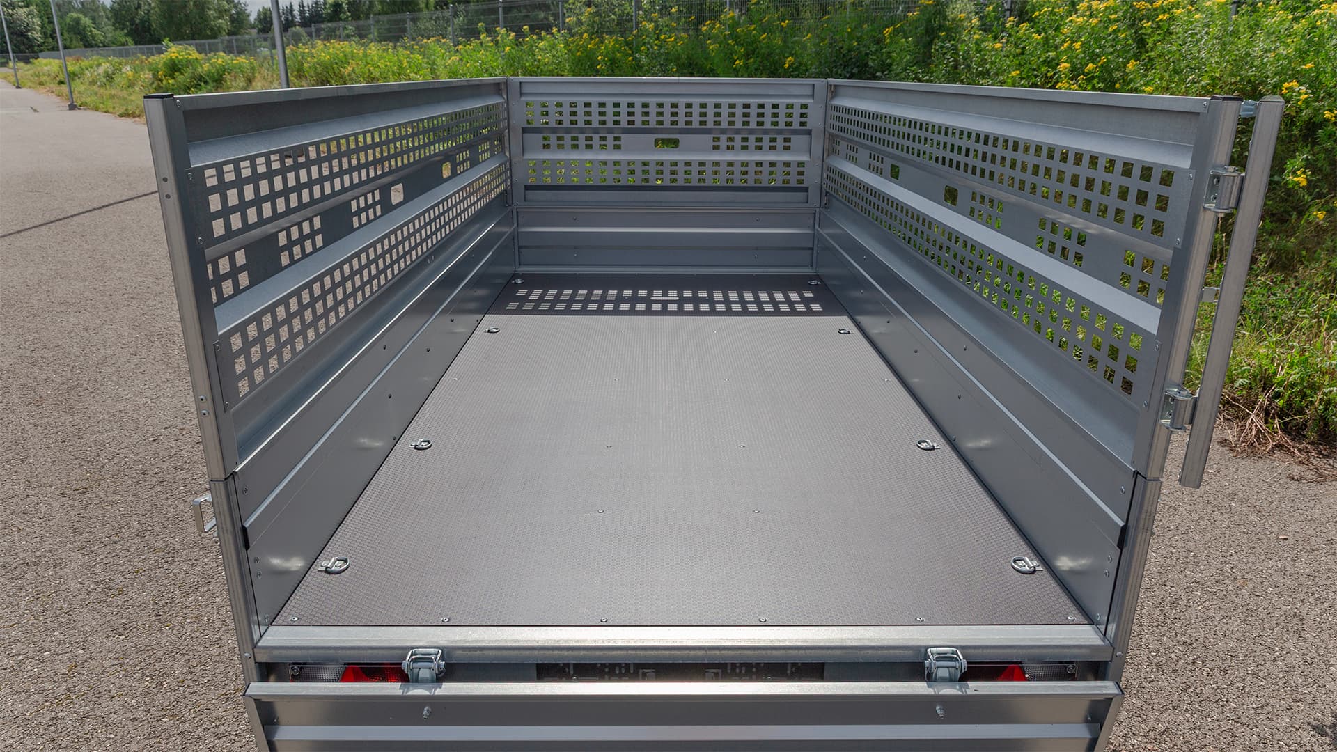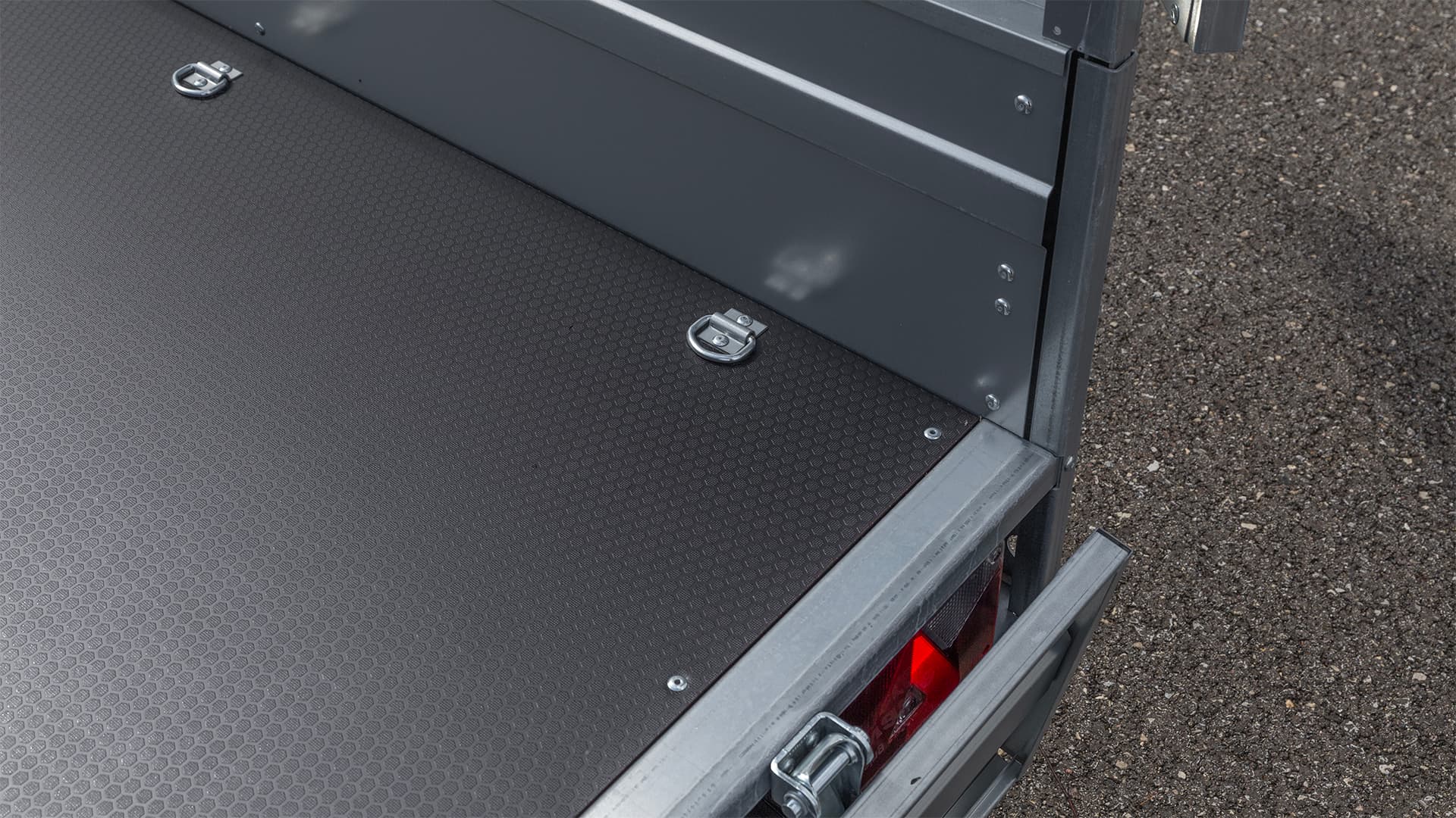 En tippbar vagn med hela 8 stycken invändiga lastöglor, ger många användningsmöjligheter. Vagnen är manuellt tippbar men förberedd för gasfjäder.